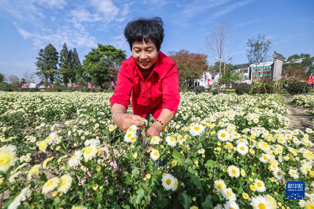 11月4日,三村村村民許巧芬在杭白菊基地里采摘杭白菊。