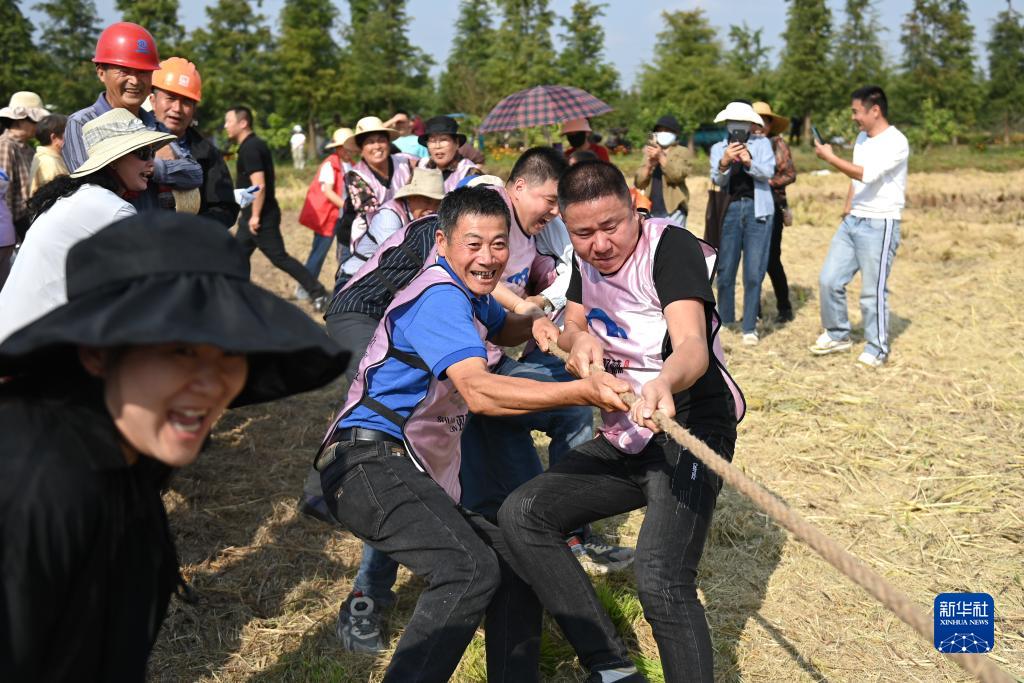 11月4日,游客在南潯區雙林鎮萬畝稻蝦綜合種養示范區參加稻田運動會拔河比賽。