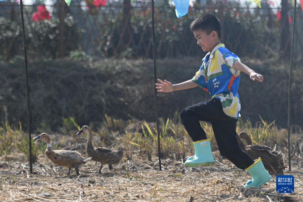 11月4日,小朋友在南潯區雙林鎮萬畝稻蝦綜合種養示范區的稻田游園會捉鴨子。