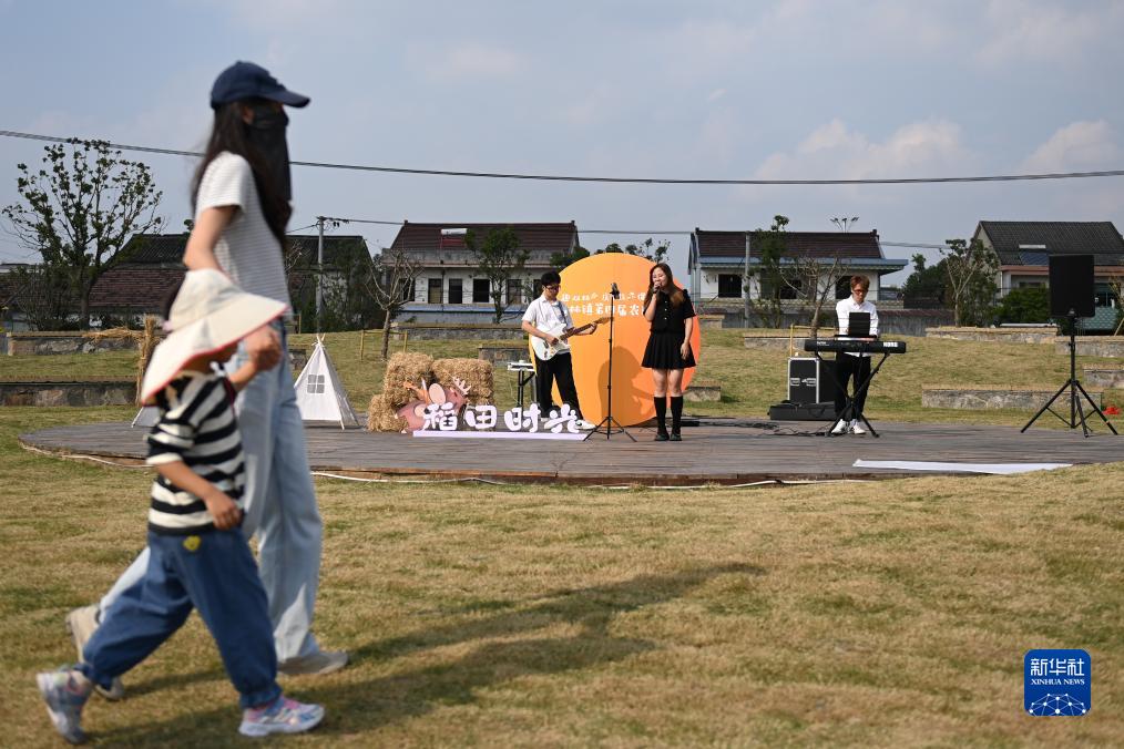 11月4日,歌手在南潯區雙林鎮萬畝稻蝦綜合種養示范區的稻田音樂會上演唱。