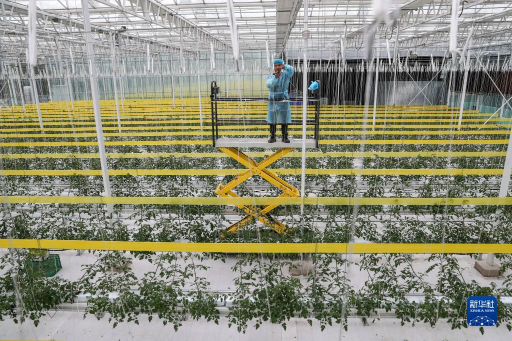 11月4日,在南通市通州區十總鎮的圓宏萬嘉智慧農場,技術員給番茄苗“盤頭”。