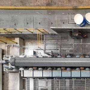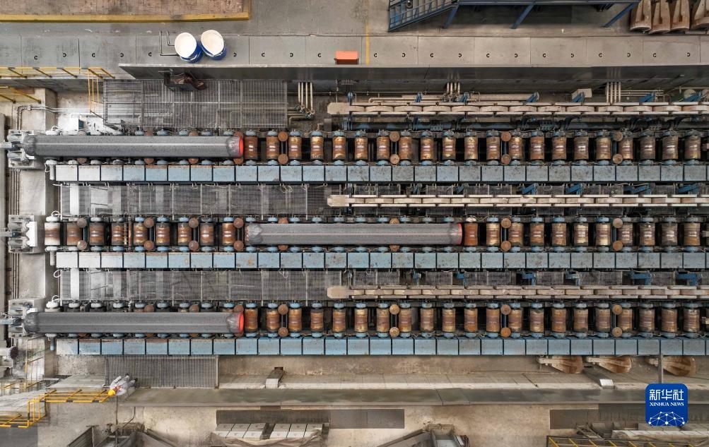 11月4日,在承德市營子區一家特殊鋼生產企業,工人操作傳送設備運送連鑄圓坯(無人機照片)。