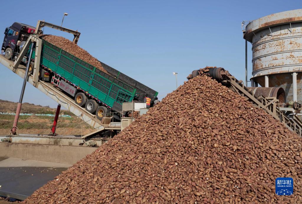 11月4日,河北省盧龍縣一家甘薯深加工企業的工人在卸載從農民手中收購的甘薯。