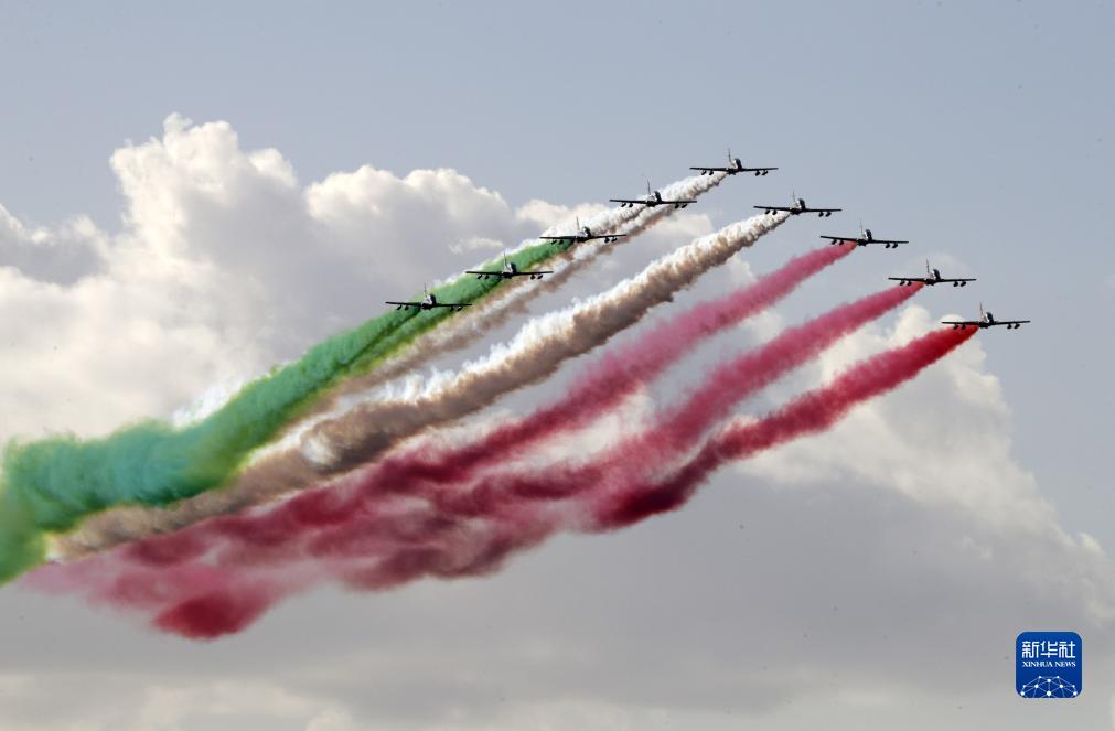 11月4日,意大利“三色箭”飛行表演隊噴出象征國旗三色的煙霧飛過羅馬上空,慶祝國家團結日。