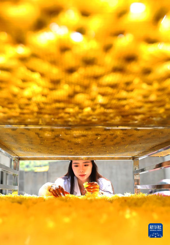 11月4日,在岳林村皇菊種植基地,員工在烘烤架上整理菊花。