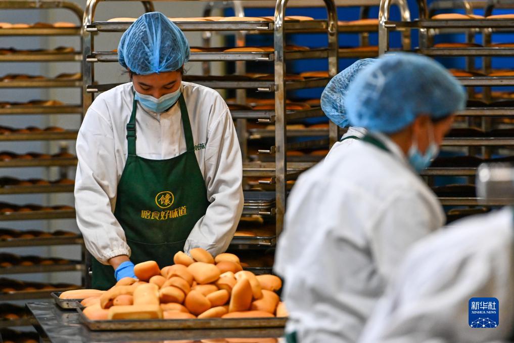 工作人員在新疆喀什綜合保稅區內的新疆疆來美農業科技有限公司分揀剛做好的糕點(11月4日攝)。