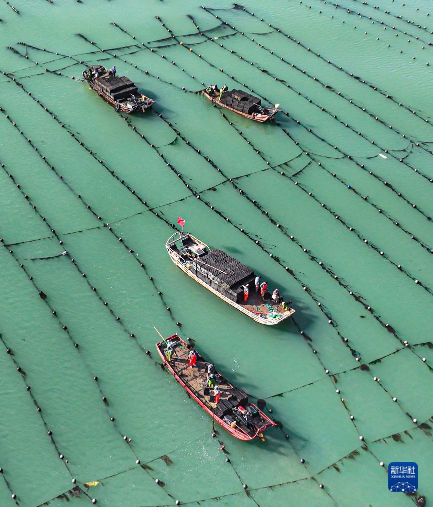 11月4日,在榮成市俚島灣海域鮑魚養殖區,養殖戶駕駛漁船捕撈鮑魚(無人機照片)。