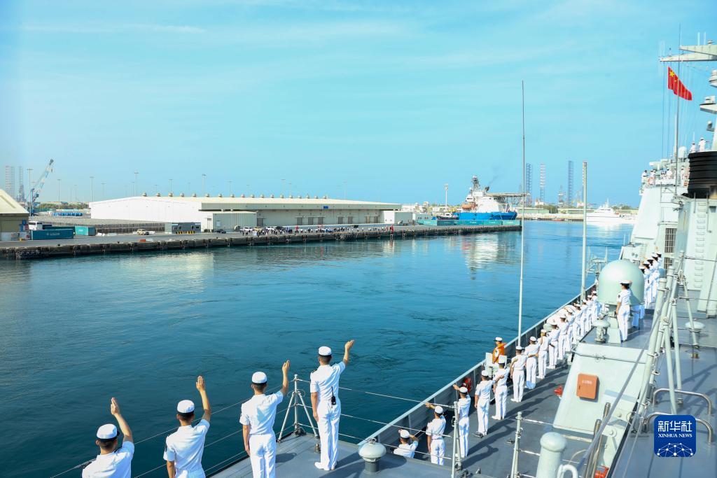 11月3日,在阿布扎比扎耶德港,中國海軍第44批護航編隊官兵向碼頭歡送人群揮手告別。