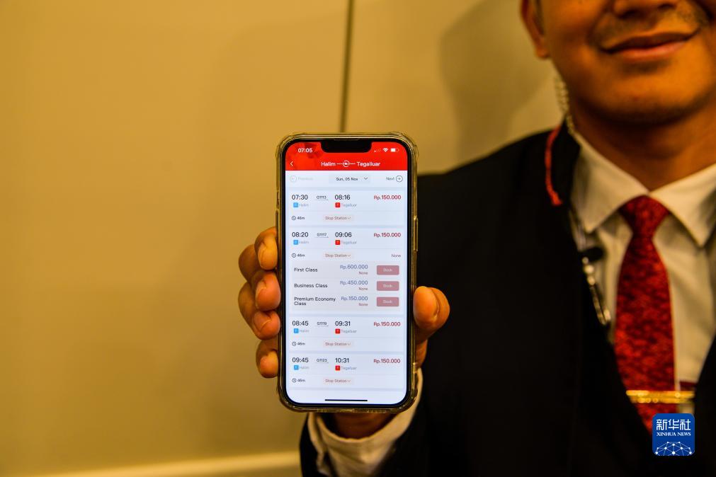 11月5日,一名乘務人員在行駛中的雅萬高鐵高速動車組列車車廂內展示雅萬高鐵購票手機應用,當日部分車次車票已售罄。