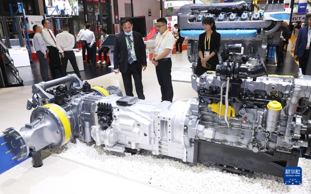11月5日,參觀者在第六屆進博會林德公司展出的的大馬力拖拉機CVT動力總成系統模型展品旁交流。