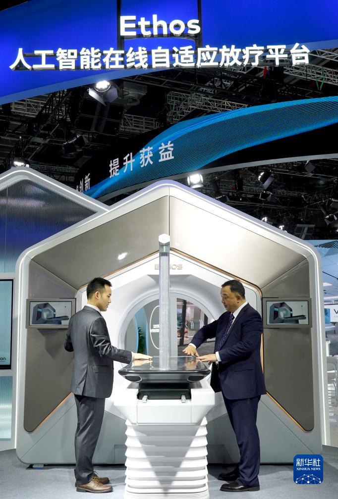 11月5日,在第六屆進博會醫療器械及醫藥保健展區,瓦里安展臺展出全球同步首發的第二代Ethos人工智能在線自適應放療平臺。