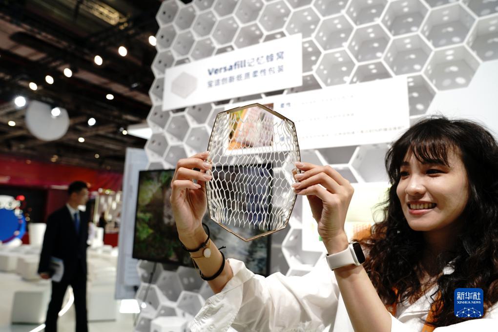 11月5日,在第六屆進博會消費品展區寶潔展臺,工作人員介紹全球首發的“記憶蜂窩”創新紙質柔性包裝產品。