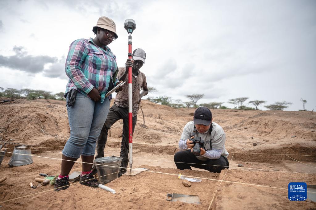 11月3日,中肯聯合考古隊隊員婁文臺(右)在位于肯尼亞巴林戈郡馬里加特鎮的考古現場拍攝發掘出的石器。