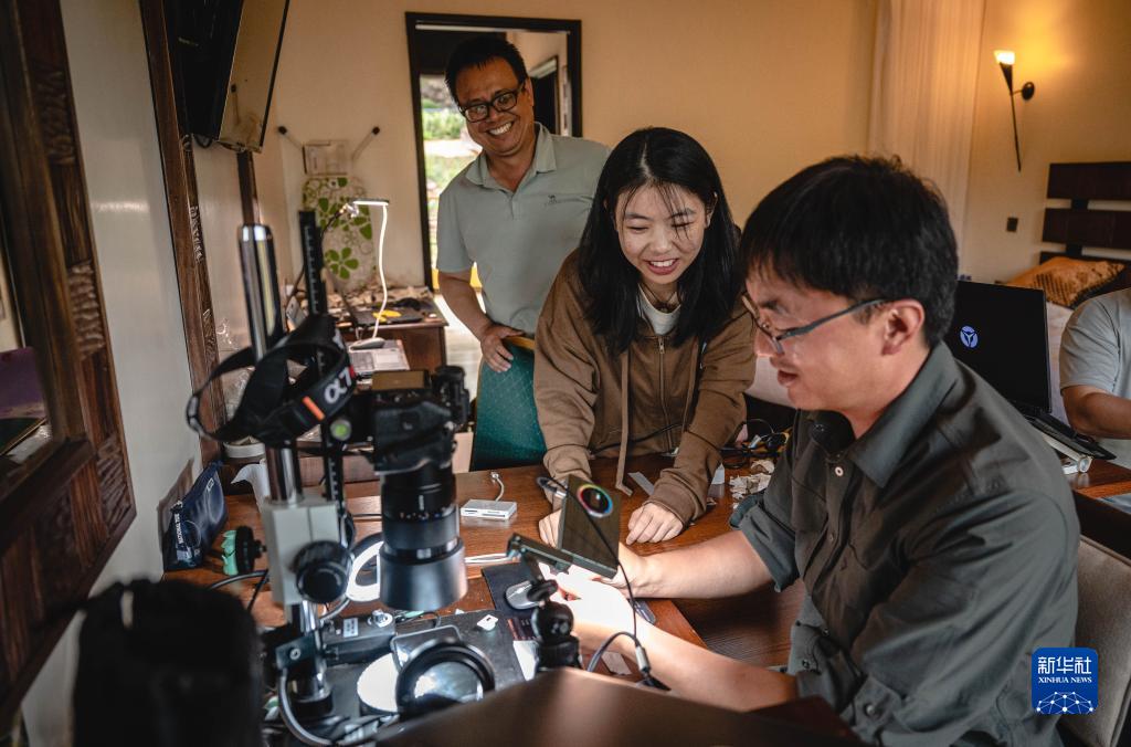 11月3日,中肯聯合考古隊中方現場負責人趙清坡(右)與隊員彭勝藍(中)、顧雪軍(左)在位于肯尼亞巴林戈郡馬里加特鎮的臨時駐地內進行交流。