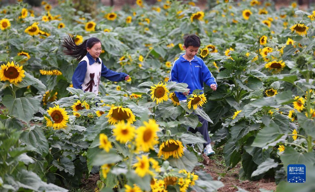 11月4日,孩子們在山東省滕州市張汪鎮一片向日葵花田里玩耍。