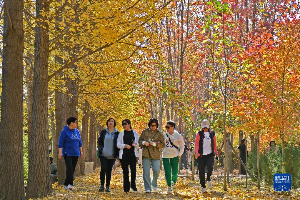 11月4日,在山東省煙臺市福山區東廳街道,游客在大自然園林觀賞秋景。