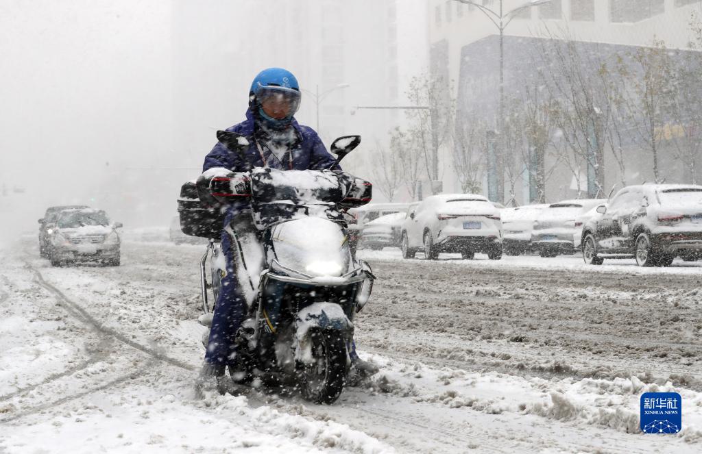 11月6日,在沈陽市渾南區,一位外賣員在雪中送外賣。