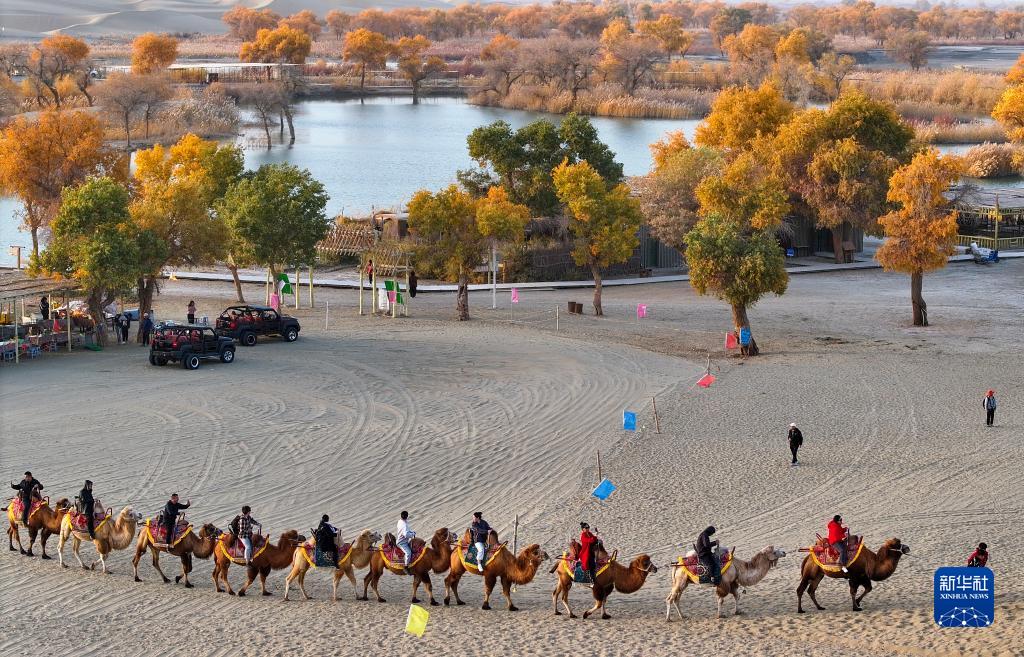 游客在新疆尉犁縣羅布人村寨景區騎駱駝游覽觀光(11月3日攝,無人機照片)。