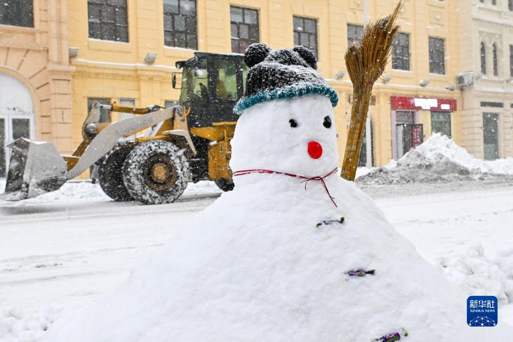 這是11月6日在哈爾濱中央大街附近拍攝的雪人,鏟雪車在一旁鏟除積雪。