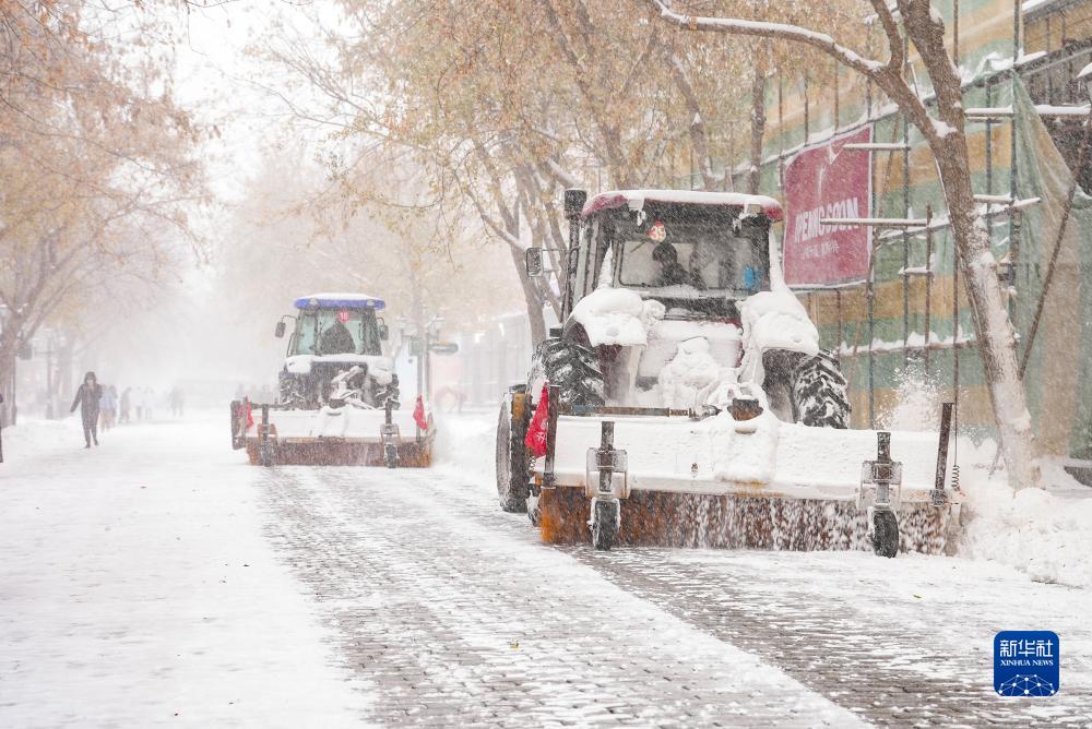 11月6日,清雪車在哈爾濱中央大街上鏟除積雪。