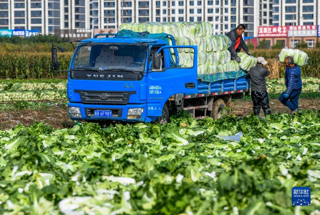11月6日,河北省玉田縣虹橋鎮農民在裝車外運白菜。