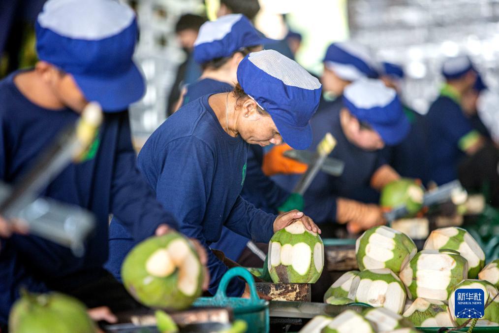 11月3日,工人在泰國叻武里府丹嫩沙多的椰子工廠切割椰子。