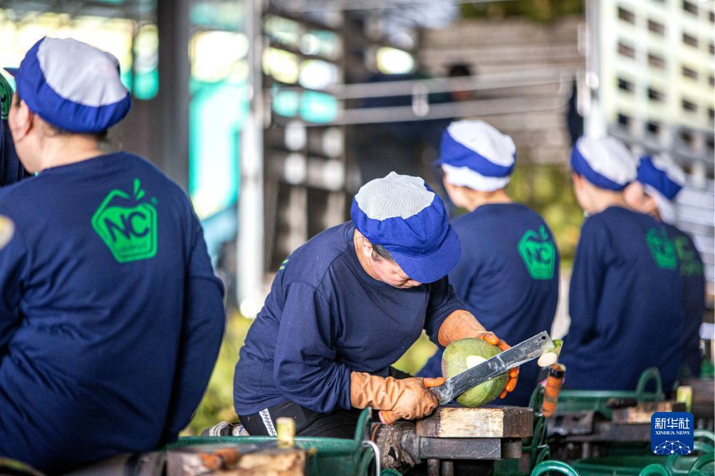 11月3日,工人在泰國叻武里府丹嫩沙多的椰子工廠切割椰子。
