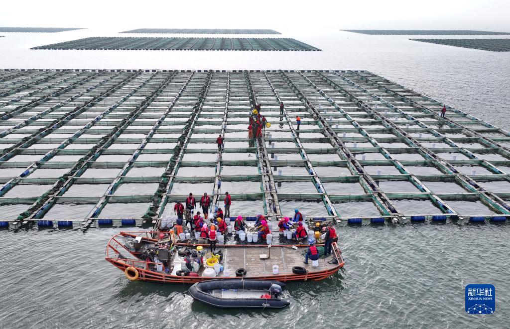 11月6日,河北省唐山市曹妃甸區一家深海網箱海參養殖合作社的社員在捕撈、分揀海參(無人機照片)。