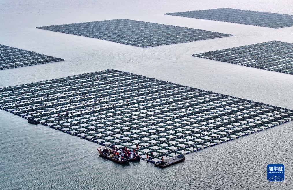 11月6日,河北省唐山市曹妃甸區一家深海網箱海參養殖合作社的社員在捕撈海參(無人機照片)。