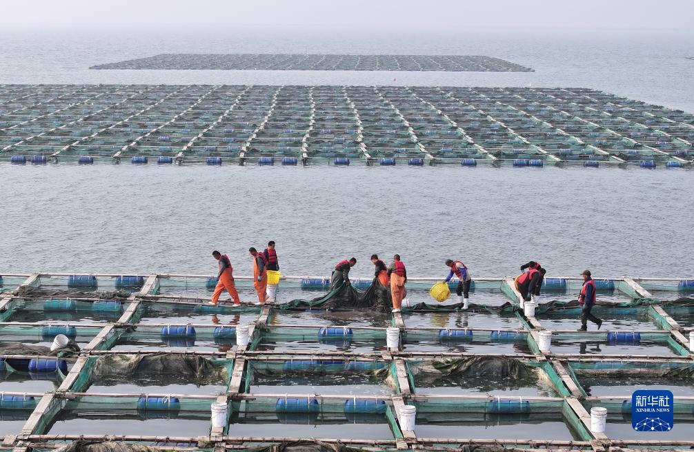 11月6日,河北省唐山市曹妃甸區一家深海網箱海參養殖合作社的社員在捕撈海參(無人機照片)。