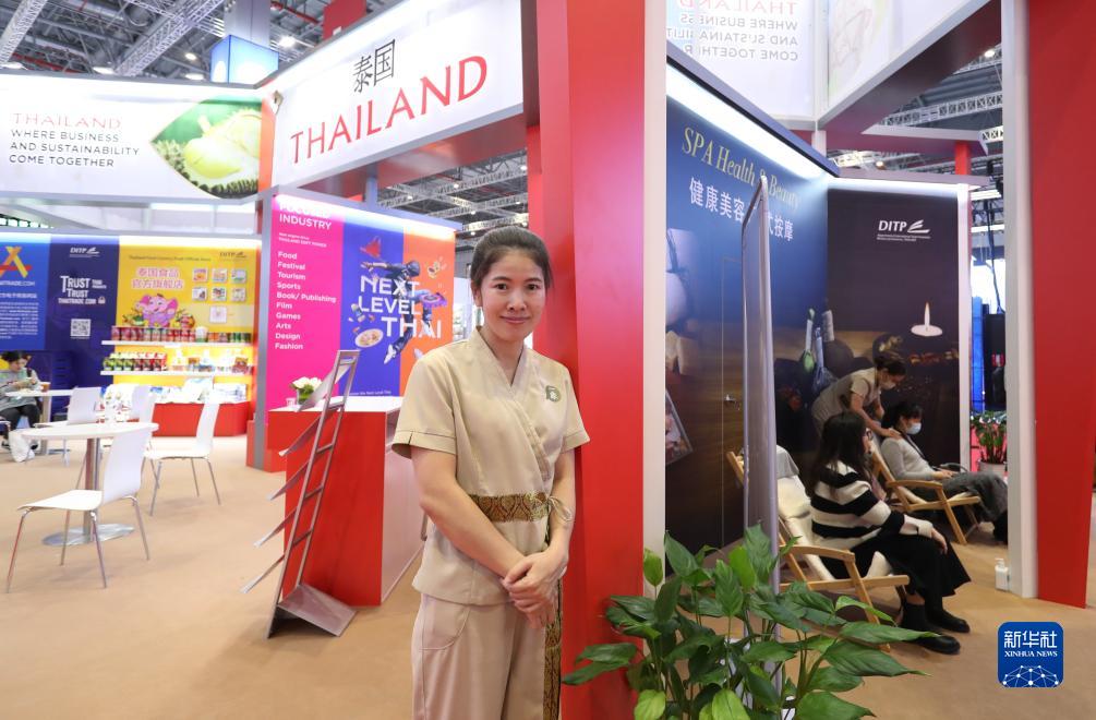 11月6日,來自泰國的寶拉站在泰國國家館展臺前。寶拉來中國八個月,目前在上海一家泰式按摩店工作,她為能代表泰國參加進博會感到自豪。