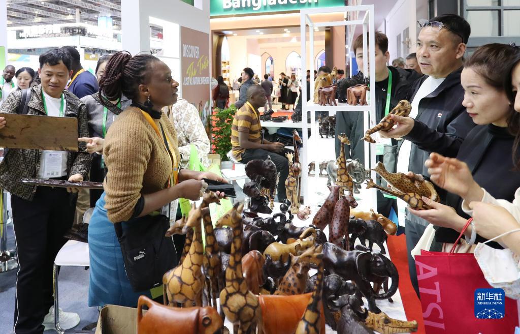 11月6日,來自津巴布韋的艾薇頓絲·察卡瓦在展臺向參觀者介紹木雕展品。這是她第一次來到中國上海參加進博會,這些木雕都是她的哥哥在家里制作的,她想通過進博會為哥哥的木雕作品找到好的銷路。