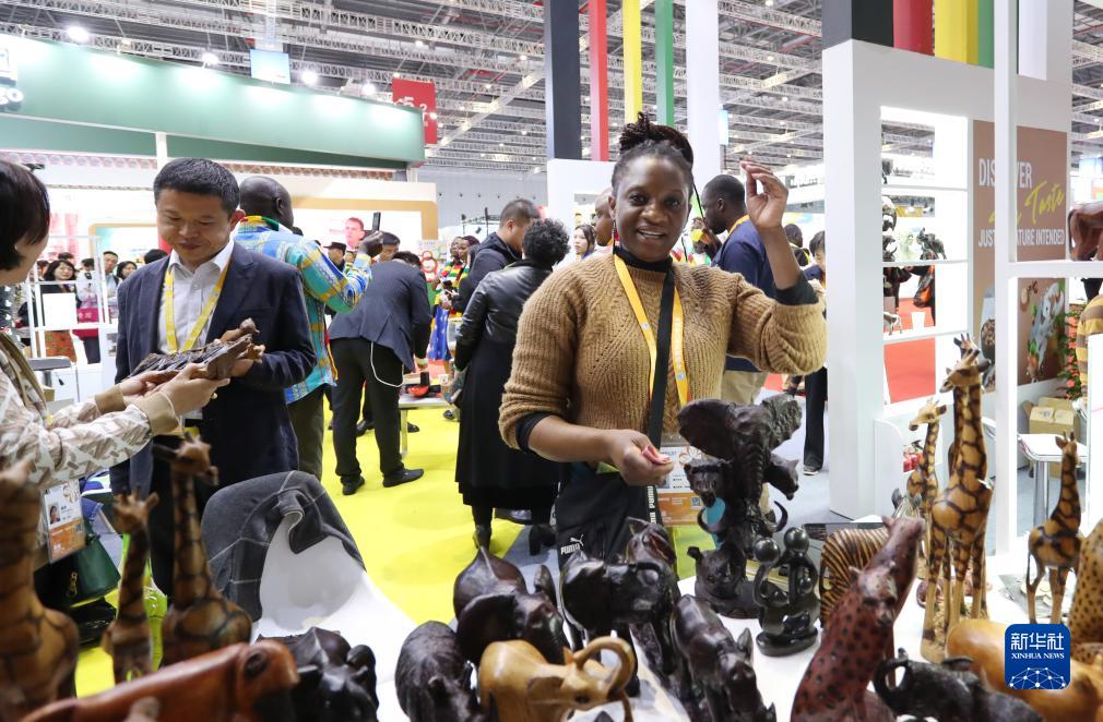 11月6日,來自津巴布韋的艾薇頓絲·察卡瓦站在她帶來的木雕作品后。這是她第一次來到中國上海參加進博會,這些木雕都是她的哥哥在家里制作的,她想通過進博會為哥哥的木雕作品找到好的銷路。