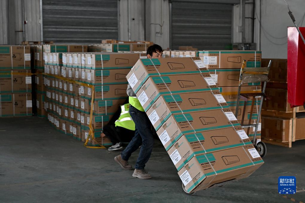 11月4日,在阿拉山口綜合保稅區內的跨境電子商務分揀清關中心,工作人員將國產空調裝車準備運往國外。