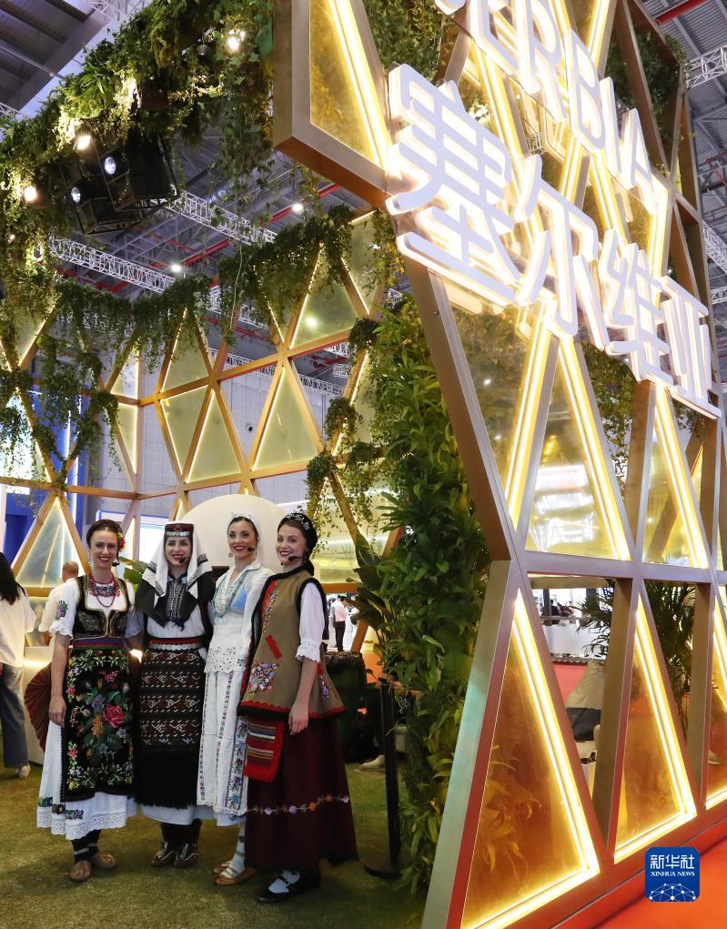 11月6日,身著傳統服飾的演職人員在第六屆進博會國家展塞爾維亞展臺迎接參觀者。
