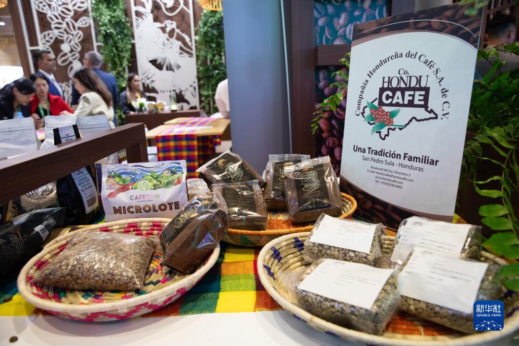11月6日,參觀者在第六屆進博會國家展洪都拉斯展臺咨詢咖啡豆等展品信息。