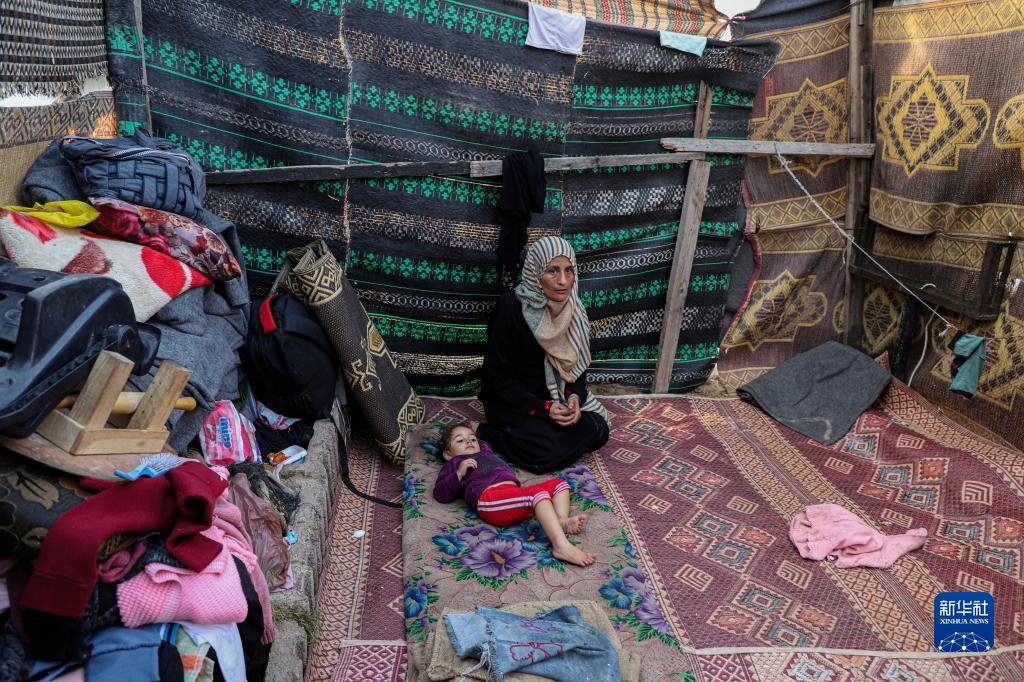11月6日,人們在加沙地帶南部城市汗尤尼斯的一處臨時難民營內休息。
