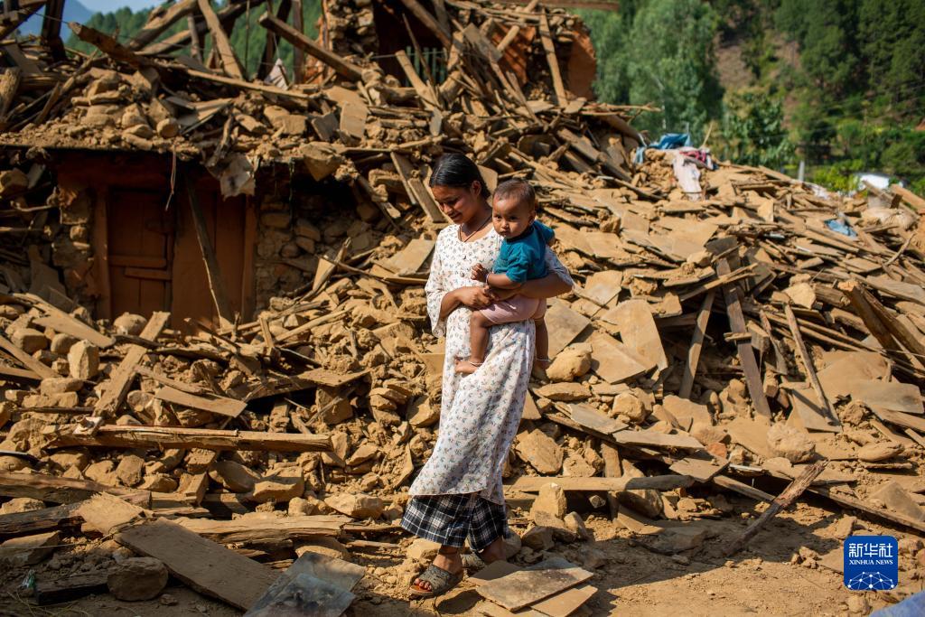 11月6日,在尼泊爾西部扎澤爾果德地震災區,一名女子抱著孩子從建筑物廢墟前走過。