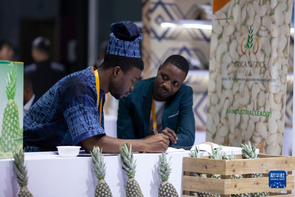 11月6日,在第六屆進博會食品及農產品展區,貝寧投資和出口促進局工作人員在交流整理客戶信息。