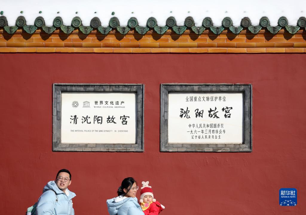 11月7日,游客走在雪后的沈陽故宮門前。