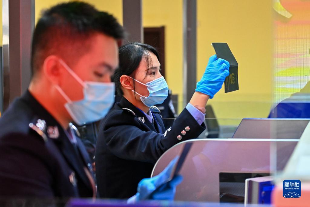 在新疆紅其拉甫口岸聯檢大廳,紅其拉甫邊檢站民警為出境旅客辦理邊檢手續(11月6日攝)。