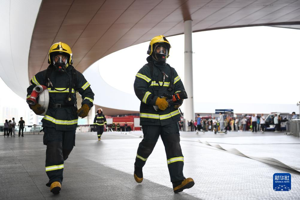 11月7日,在港珠澳大橋珠海公路口岸,澳門消防員在演練中。