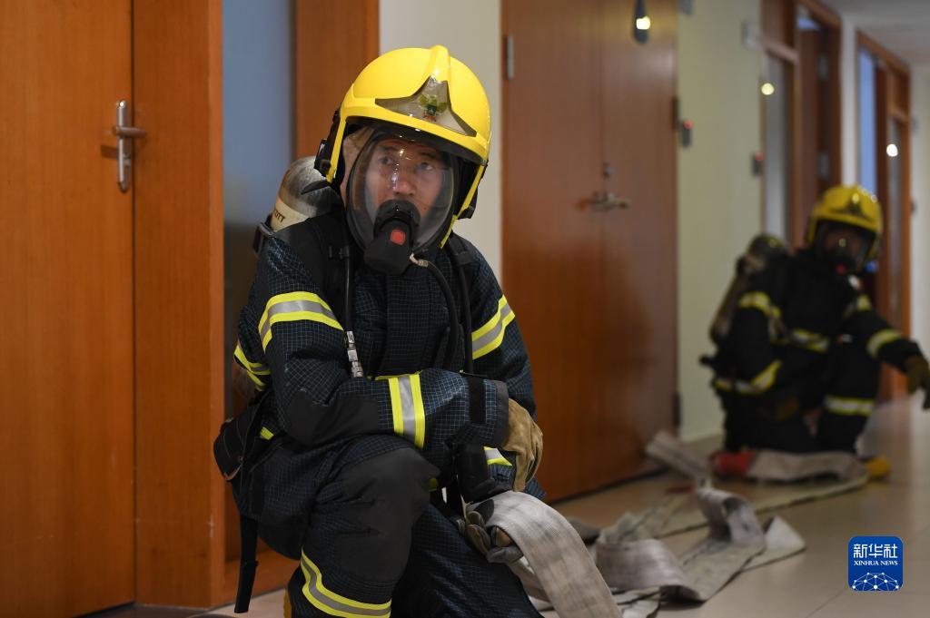 11月7日,在港珠澳大橋珠海公路口岸旅檢大樓,澳門消防員在演練中布設水帶。