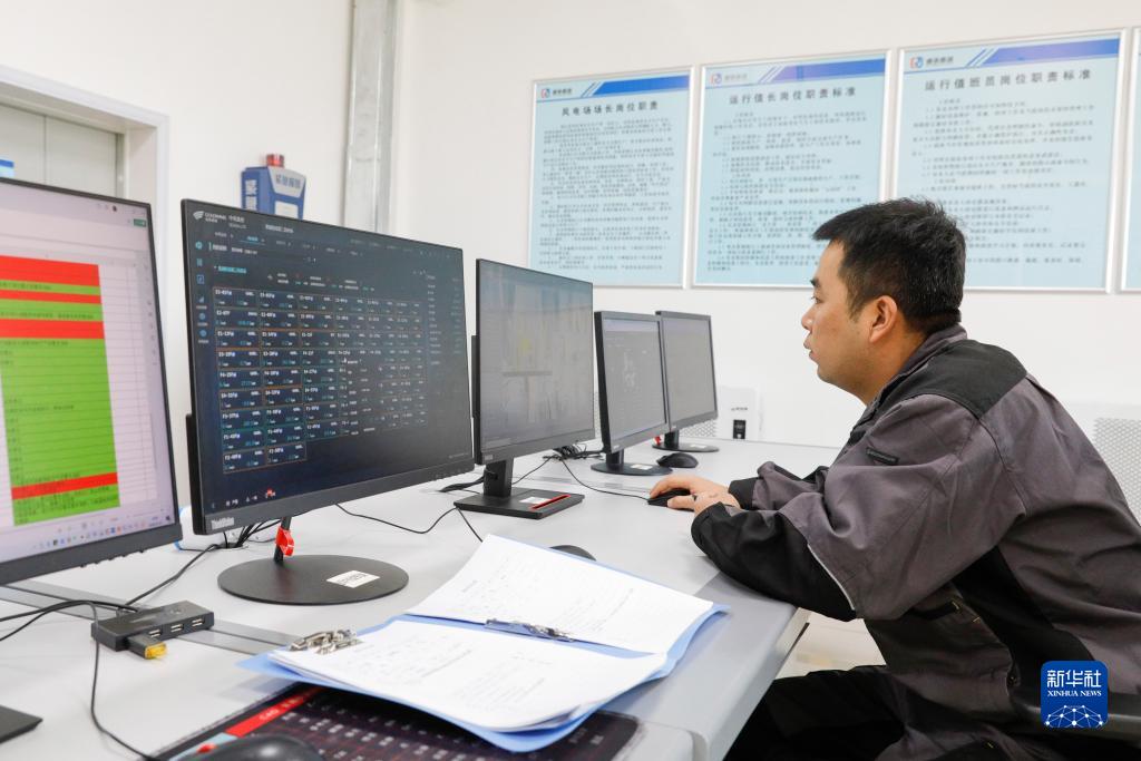 11月7日,在甘肅省酒泉市瓜州縣泰源橋南第三風電場,工作人員在中控室監測風電場運行情況。