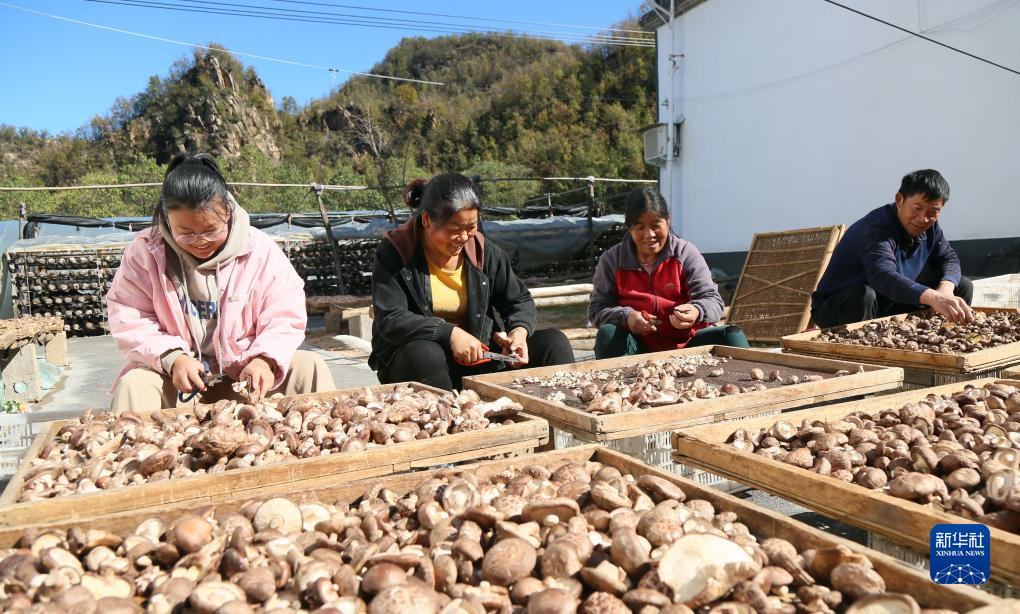 11月6日,在河南省洛陽市汝陽縣靳村鄉石寨村,農民在挑揀香菇。