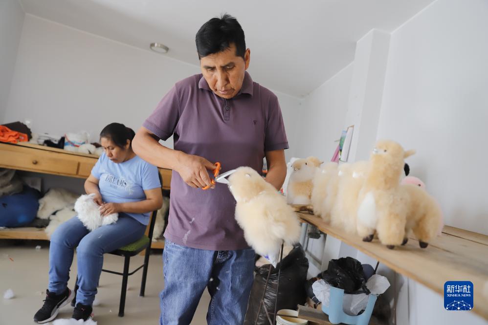 在秘魯南部城市阿雷基帕的工坊內,馬馬尼大叔(右)和妻子格洛麗亞打磨準備在上海進博會上展示的羊駝玩偶(10月27日攝)。