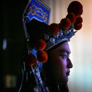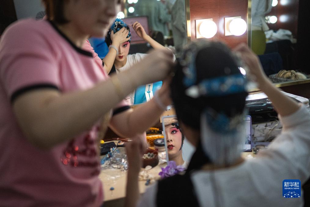 暮色漸起,在湖北戲曲藝術中心(首義劇場)的后臺,即將演出的年輕演員們或涂抹油彩、勾畫眉目,或梳理髯口、佩戴釵環,或開嗓練聲、熟悉走位,繁忙而有序。