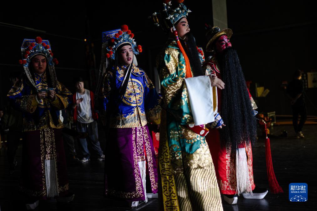 10月28日,楚劇演員艾子竣、張子涵、王超 、何汶杰(從右至左)在臺邊候場,等待出演《秦瓊表功》。