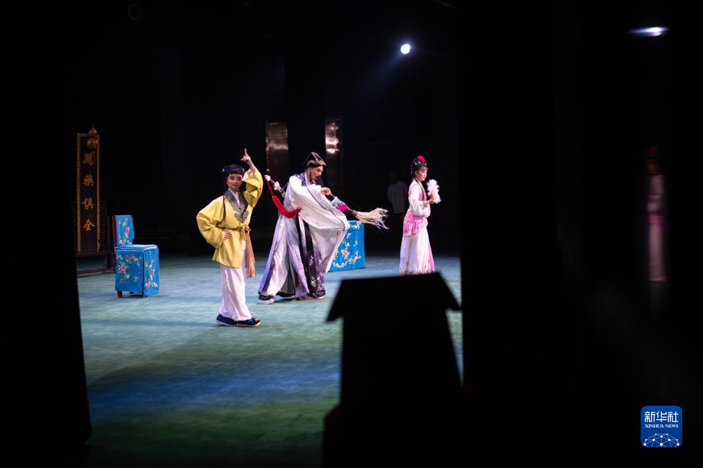 10月28日,黃梅戲演員李洋(中)、李曉悟(左)、殷蔓露(右)在表演《戲牡丹》。