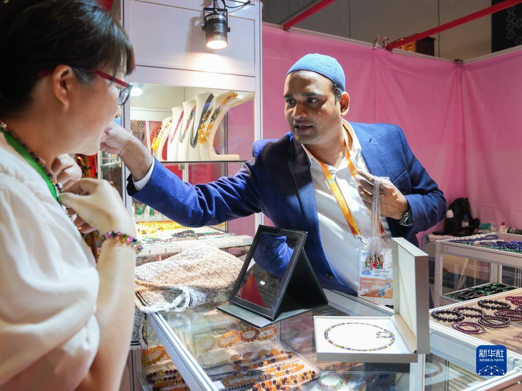 11月7日,在第六屆進博會消費品展區,一名來自巴基斯坦的展商向參觀者介紹項鏈。